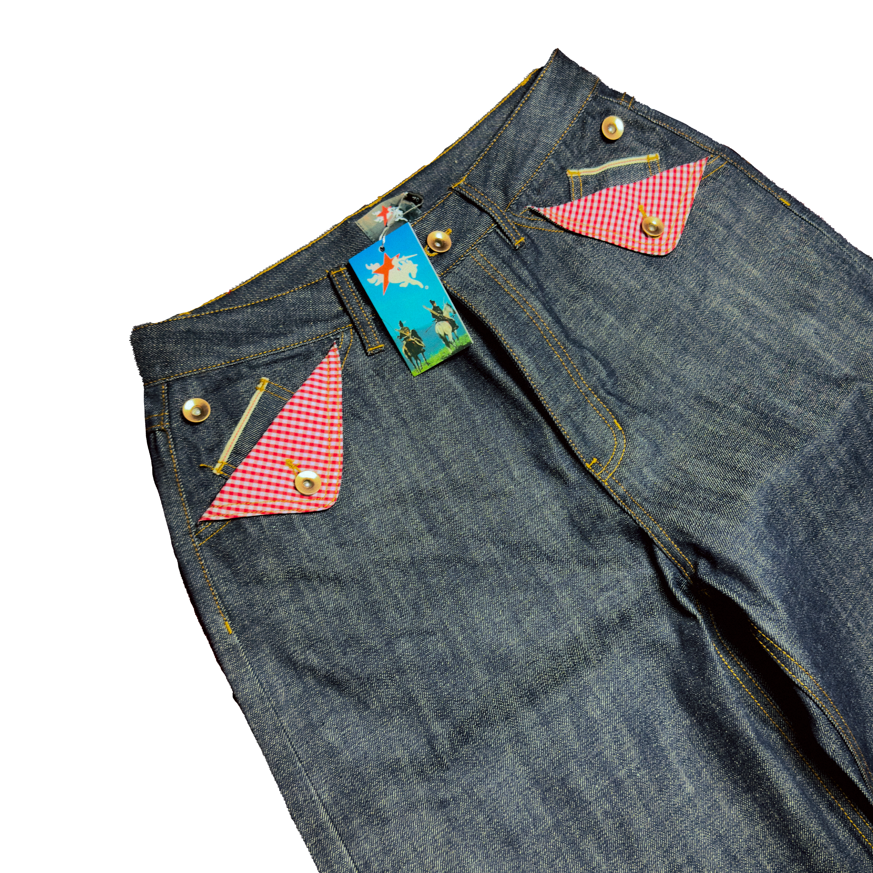 - Featuring mule pockets with a red plaid lining, and 2 coin pockets with selvedge ID.